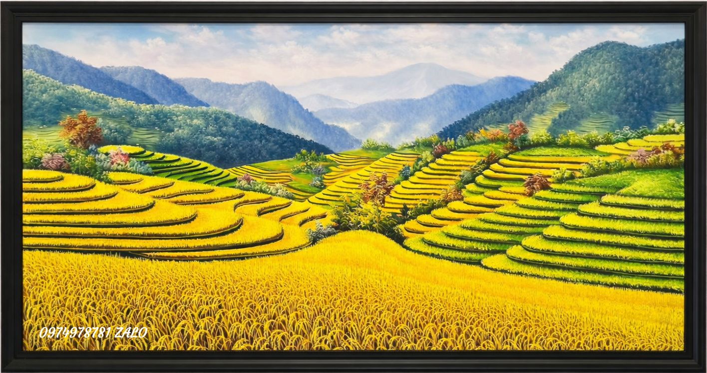 Trong tranh sơn dầu ruộng bậc thang, các họa sĩ thường sử dụng gam màu vàng óng của mùa lúa chín, sắc xanh mướt của mạ non hoặc sắc nâu trầm của đất núi để tạo chiều sâu và sự sống động. Những đường cong mềm mại của ruộng bậc thang ôm lấy sườn đồi tạo nên bố cục hài hòa, mang tính nghệ thuật cao. Khi treo tranh ruộng bậc thang trong phòng khách, phòng làm việc hay không gian văn phòng, bức tranh không chỉ giúp mở rộng chiều sâu thị giác mà còn mang lại cảm giác thư thái, gần gũi với thiên nhiên.